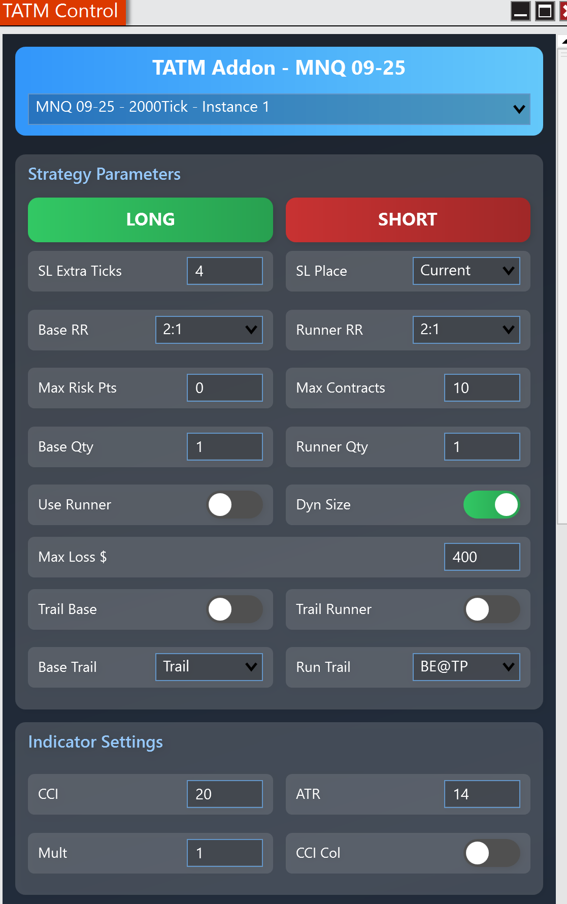 * **Base/Runner Position Quantity:** The fixed number of contracts to trade for the base and runner positions. This is only used if Enable Dynamic Sizing is false.