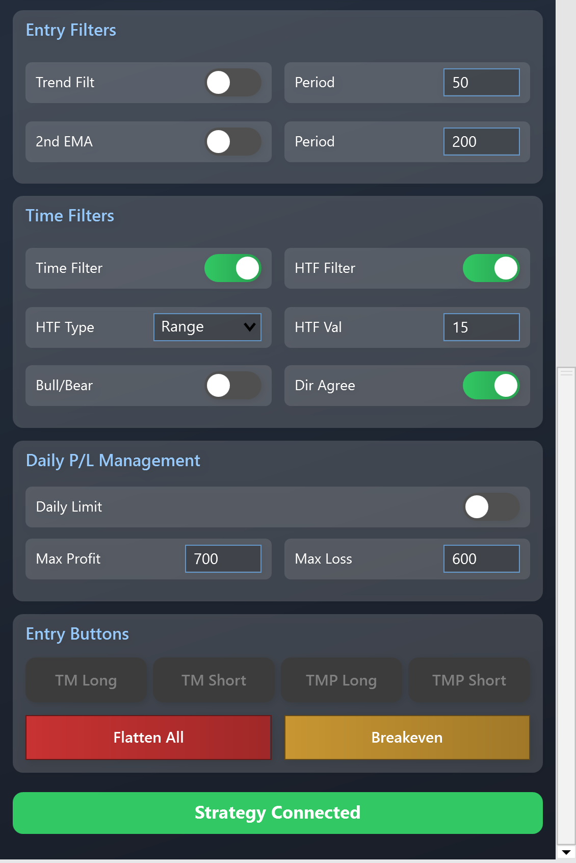 * **Arm Manual TM Trade:** Tell the strategy you are ready and it should take the very next crossover signal that appears and passes all filters.